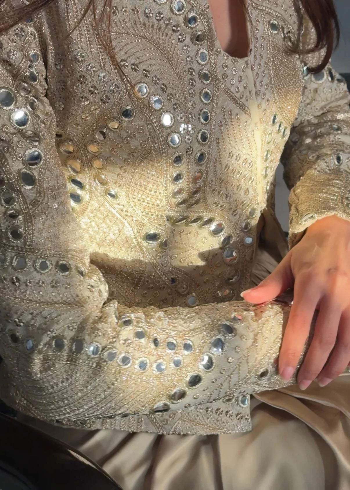 The jacket is a showcase of traditional artistry, adorned with detailed mirror work, shimmering sequins, and fine thread embroidery. Designed to hug the body for a "dream fit," it features a sophisticated high collar and full sleeves that exude a regal, refined presence.